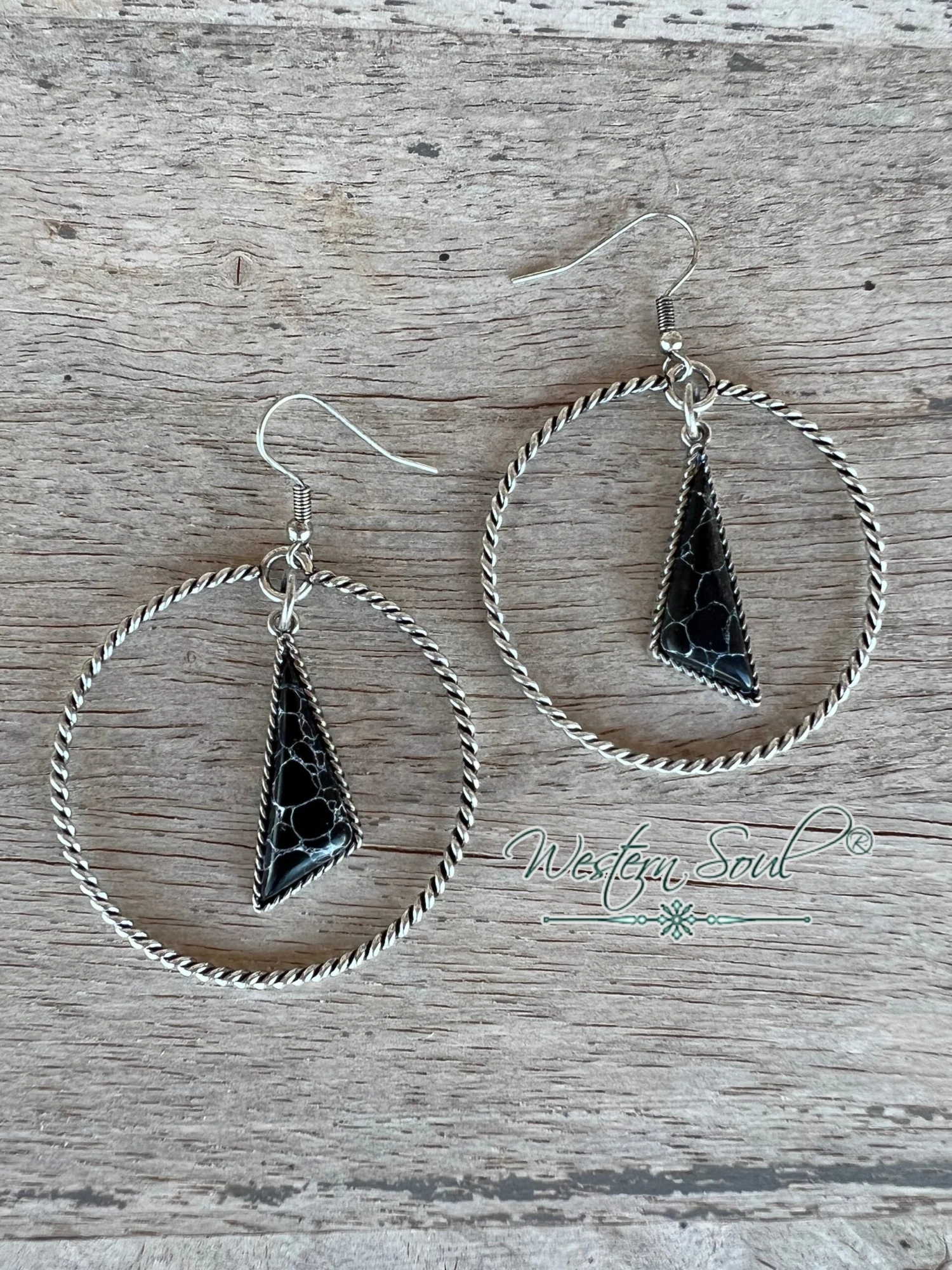 Women’s dangle earrings with a circular rope design and a black colored pendant.