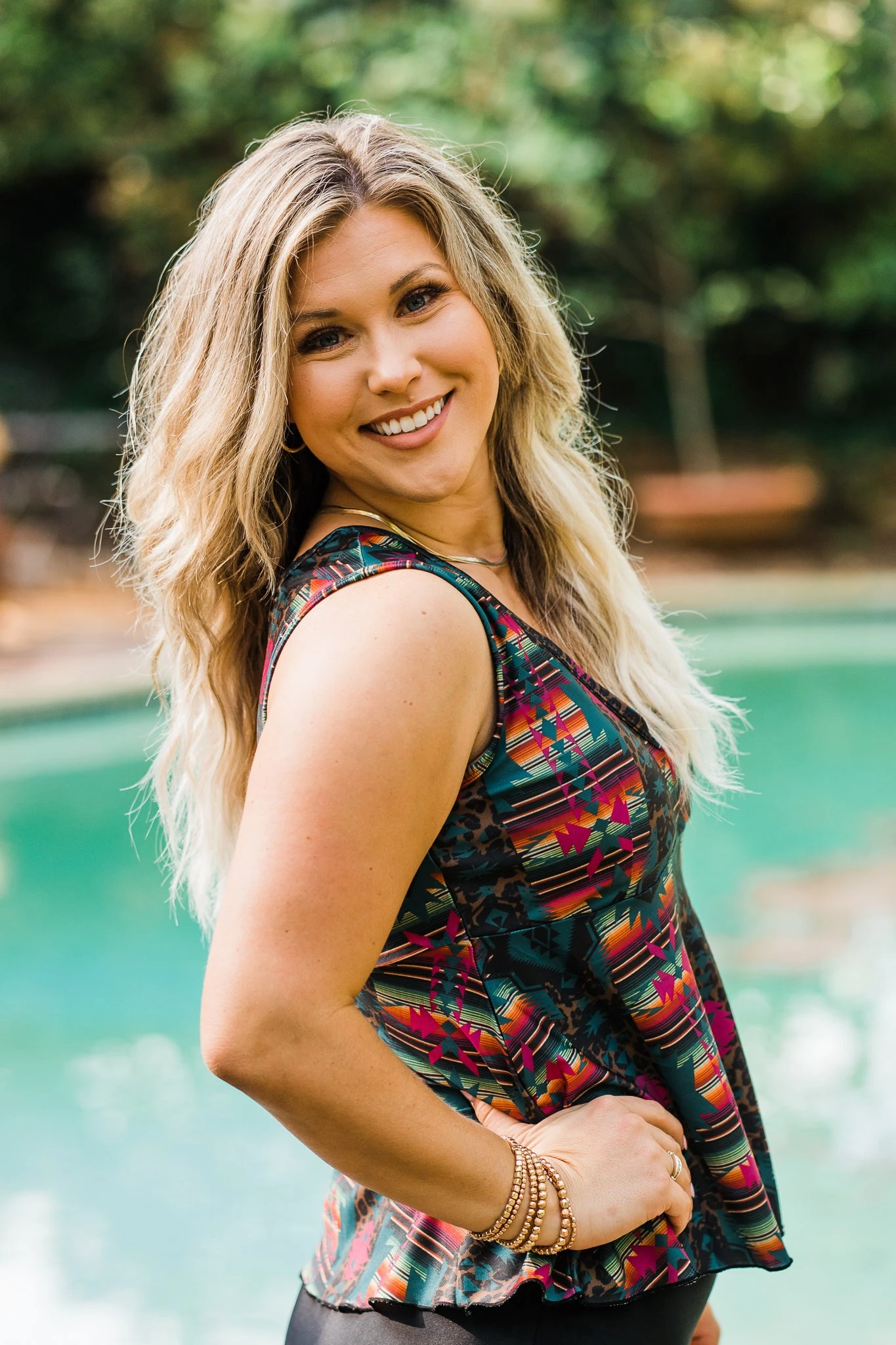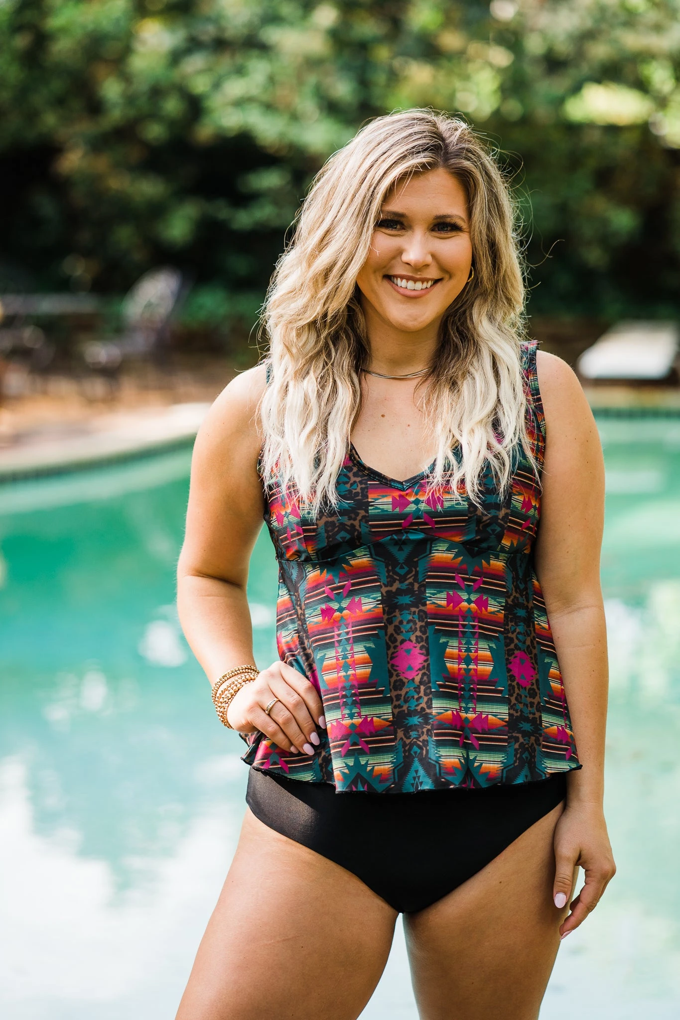 Western style tankini top. Pair this with our solid black bottoms and have fun in the sun. The leopard in this tankini also matches the Super Summer Swim Bottoms and looks super cute paired together.