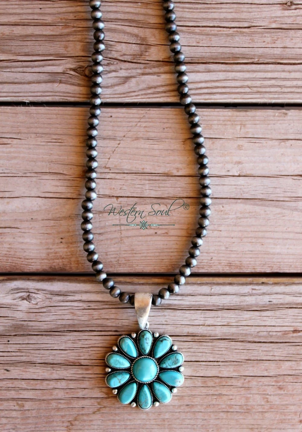 Women’s western necklace with Navajo pearls Stryker beads and flower pendant.